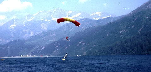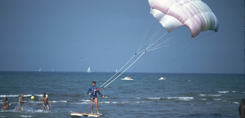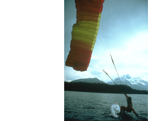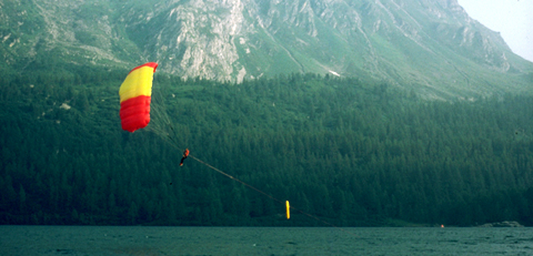 To my knowledge, the runner-up world champion in paragliding 1987, Andrea Kuhn, was the first kitesurfer in the world. In the 1970s he already knew how to do a water launch with a windsurfing board and a Skywing. Later on he even took off from Corvatsch Glacier to touch down on Lake Sils after a spectacular flight and glide across the lake as a kitesurfer. Check out the pictures and the award-winning film "Andrea". Dieter Strasilla already practiced the "bodydrag" and water jumps back then; in his patents he decribed the kite with long tethers and remote control.