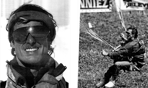 »Il est une erreur de la creation!" nous dit l`ancien pilote Swissair, Markus Rizzi, inspecteur des ecoles FSVL. »C'est en tant qu´oiseau qu'il aurait du venir au monde. Difficile de comprendre pour quelle raison il est devenu un etre humain!» Le pionnier du parapente, ANDREA KUHN de Sils Baselgia en Engadine maitrise son metier. Voila 20 ans qu 'il fait en moyenne deux vols par jour. En 1989, il est troisieme aux CS/Saleve. Un vol biplace du Mount Mc Kinley et un vol triplace du Cho Oyo au Nepal representent les moments forts de sa carriere de pilote. Son pere dirigeait une entreprise de construction. Tout petit, Andrea se plaisait a bricoler des objets en Sagex pour jouer dans le vent avec eux. Pour de tels jeux, il n'y avait d'endroit plus ideal que Sils avec son vent du Maloja. Deja grand-papa etait inspire par ce vent se laissant tirer sur patins a glace, parapluie a la main, ou sur skis tenant une bache de foin ouverte. Andrea, pour sa part, revait de voler. A la question, que veux-tu devenir un jour, qui lui fut posee a l'ecole primaire, Andrea repondit avec la plus grande assurance: "pilote de fusee!» II n 'en arrivait pas la, mais devient finalement professeur avec un penchant permanent pour le sport: surf, ski et surtout vol libre.