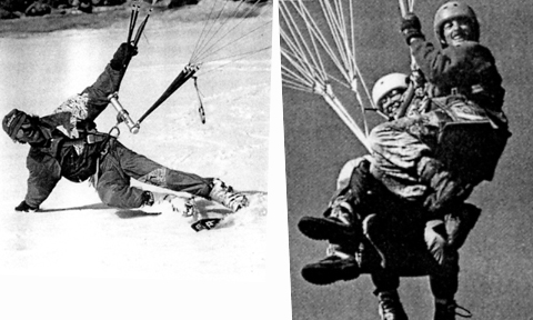 Ende der 60er, Anfang der 70er Jahre unternahmen die Amerikaner mit Fallschirmen erste Versuche, ihre Fluggeräte zu FUSS zu starten und steile Berge hinunterzugleiten. Parallel dazu machten zwei andere Pioniere beachtliche Fortschritte: Dr. Dieter Strasilla und Andrea Kuhn. Seit 1961 entwickelte der Chemiker Dr. Strasilla Rundkappenschirme, bald bekam er über seinen Bruder Rundkappen-Schirme der NASA, welche er dann weiterentwickelte. Er ließ sich auf Skiern die Berge hinauf schleppen. Anfang der 70er Jahre wurde die runde von der rechteckigen Form verdrängt. Die steuerbaren Skywing-Segel eigneten sich nicht nur als Schlepphilfe in den Bergen, sondern wurden auch dazu verwendet, auf Wiesen und Seen mit dem Wind zu spielen - und schließlich konnte man damit fliegen!