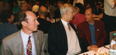 Jacques und Bertrand Piccard und Dieter Strasilla beim Festessen anlässlich des 20jährigen Jubileums des SHV-FSVL im Wallis. Vater Jacques forschte in der Tiefsee, Bertrand hingegen flog Drachen und dann mehr mit Ballonen – schliesslich in einer spektakulären Ballonfahrt um die Welt.